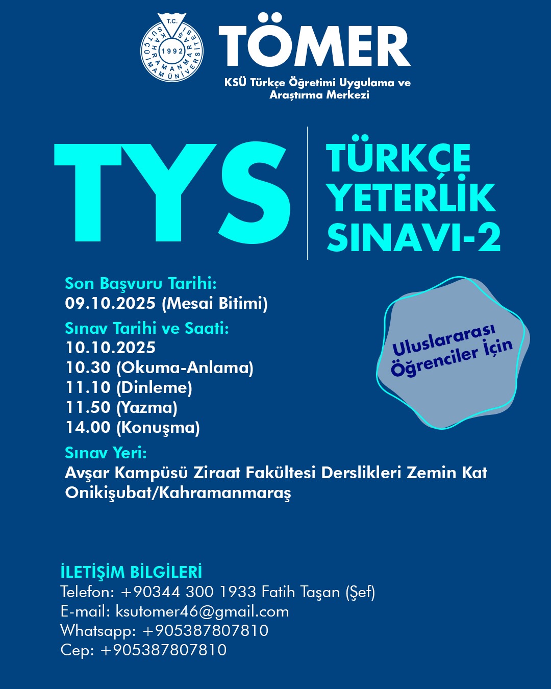 10.10.2025 tarihinde Türkçe Yeterlilik Sınavı yapılacaktır. Başvurular başlamıştır. Ayrıntı için tıklayınız.